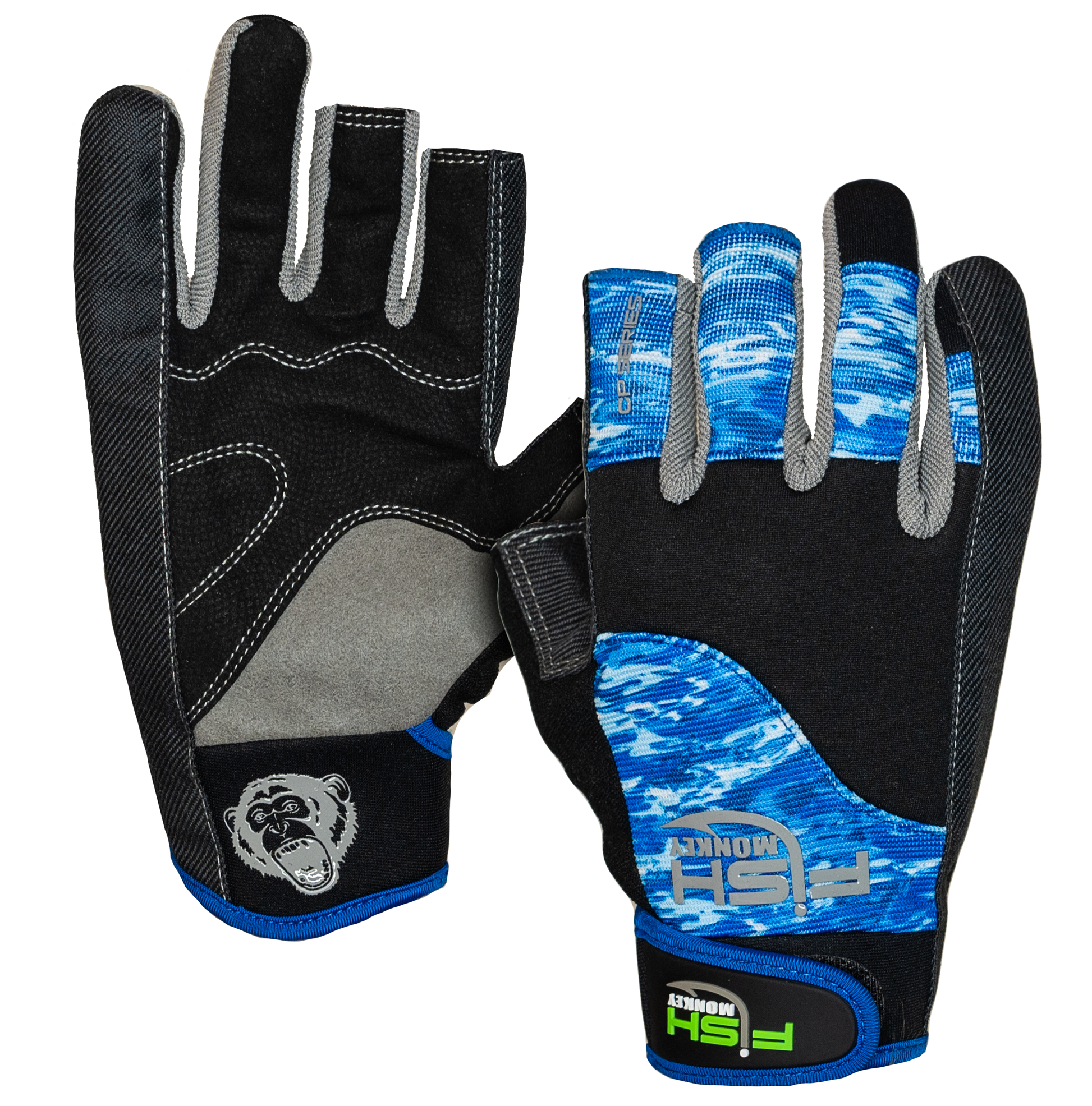 Kevlar-reinforced material protects your hand. PVC Monkey Grip palm and fingers allows for superior leader grip. Four-way stretch material allows for perfect fit and quick drying. Synthetic leather palm offers superior strength with second skin dexterity. Exposed key fingers and thumb allow for greater dexterity and finger use. Velcro wrist closer offers easy on/easy off of gloves. Designed by Charles Perry, expert offshore deckhand, captain and world-record holder.